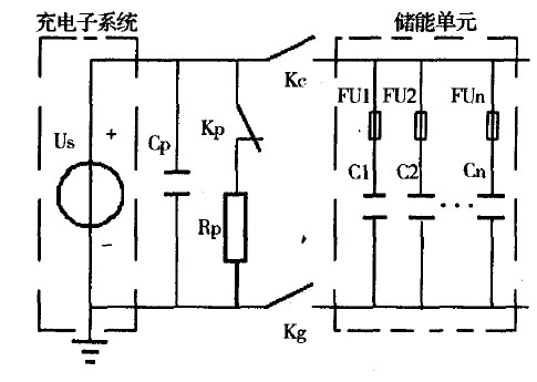 通常,充電子系統內部配有過電流、過電壓和過熱等故障保護或異常告警裝置。但這些裝置的保護范圍一般僅限于充電子系統內部,PPS放電時浪涌電壓等外部因素仍可能造成充電設備損壞。因此,在儲能單元和充電子系統間還需配置一些隔離和保護電路。圖1給出了用于ETCG研究的PPS所配置的充電隔離及保護電路。圖1中,充電隔離開關(Kc)和地絕緣隔離開關(Kg)在充電結束后打開,用以防止PPS放電時由負載等因素產生的浪涌高電壓通過充電子系統對地放電,可以避免因此所造成的充電設備絕緣損壞;充電輸出終端并聯了一小容量電容器(Cp)及其安全釋能電路(開關Kp、電阻Rp),目的在于防止空載誤充電,以避免在此情況下充電電路末端電壓急劇升高損壞充電設備。