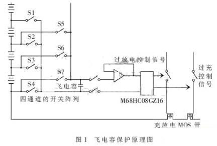 對于單體電池的檢測,主要采用飛電容技術。飛電容技術的原理圖如圖1所示,為電池組后4節的保護電路圖,通過四通道的開關陣列可以將后4節電池的任意1節電池的電壓采集到單片機中,單片機輸出驅動信號,控制MOS管的導通和關斷,從而對電池組的充電放電起到保護作用。