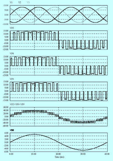 將單相矩陣級聯串組合成星形連接,便形成了三相輸入三相輸出的交流電。如圖10所示,