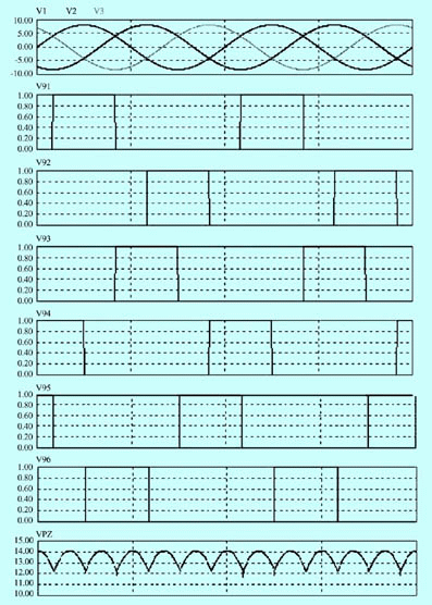 虛擬整流技術的實現,主要通過三相同步檢測電路取得同步控制信號,然后控制功率器件來模擬二極管橋式整流電路對三相交流電進行整流,同時防止輸入的三相交流電相間短路。其原理如圖9所示,是一個輸出方向固定的虛擬整流電路。仿真波形如圖5所示,它們分別是矩陣變換單元的三相輸入電壓、6路同步信號和虛擬整流后得到的輸出電壓波形。