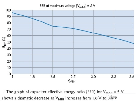 從設計角度看,超級電容和電池的根本區別在于電容器在充/放電周期發生的顯著電壓變化。充電時,理論上,電容器的電壓從零上升到其最高額定電壓,而電池的端電壓在其工作周期中變化很小。超級電容是電子電容器的一個子集。可通過下式得出能從超級電容放電周期中(放電周期是指電容器的端電壓從其最大值VMAX變為最低工作電壓VMIN的過程)獲得的有效能量EEFF: