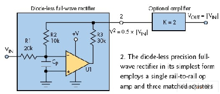 在滿足等式3的條件下,電路在點2具有1/2的增益。可添加一個增益為2的非反相放大器以得到一致的整體增益,從而實現工作等式VOUT=|VIN|。