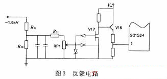 高壓經(jīng)R30,R31分壓濾波送至場(chǎng)效應(yīng)管V17,經(jīng)V17電壓放大后,再經(jīng)射隨器輸出,送至SG1524的1端。假設(shè)電源電壓降低或負(fù)載電阻變小引起輸出電壓降低時(shí),則反饋到SG1524內(nèi)的誤差放大器反相輸入端1的電壓將減小,誤差放大器輸出電壓將增加,從而使加到脈寬調(diào)制比較器反相輸入端電壓增大,輸出晶體管的導(dǎo)通時(shí)間變大,故功率晶體管導(dǎo)通時(shí)間也變長(zhǎng),占空比Q變大,從而使輸出電壓Vo能回到原來(lái)的穩(wěn)定值。反饋電路如圖3所示。