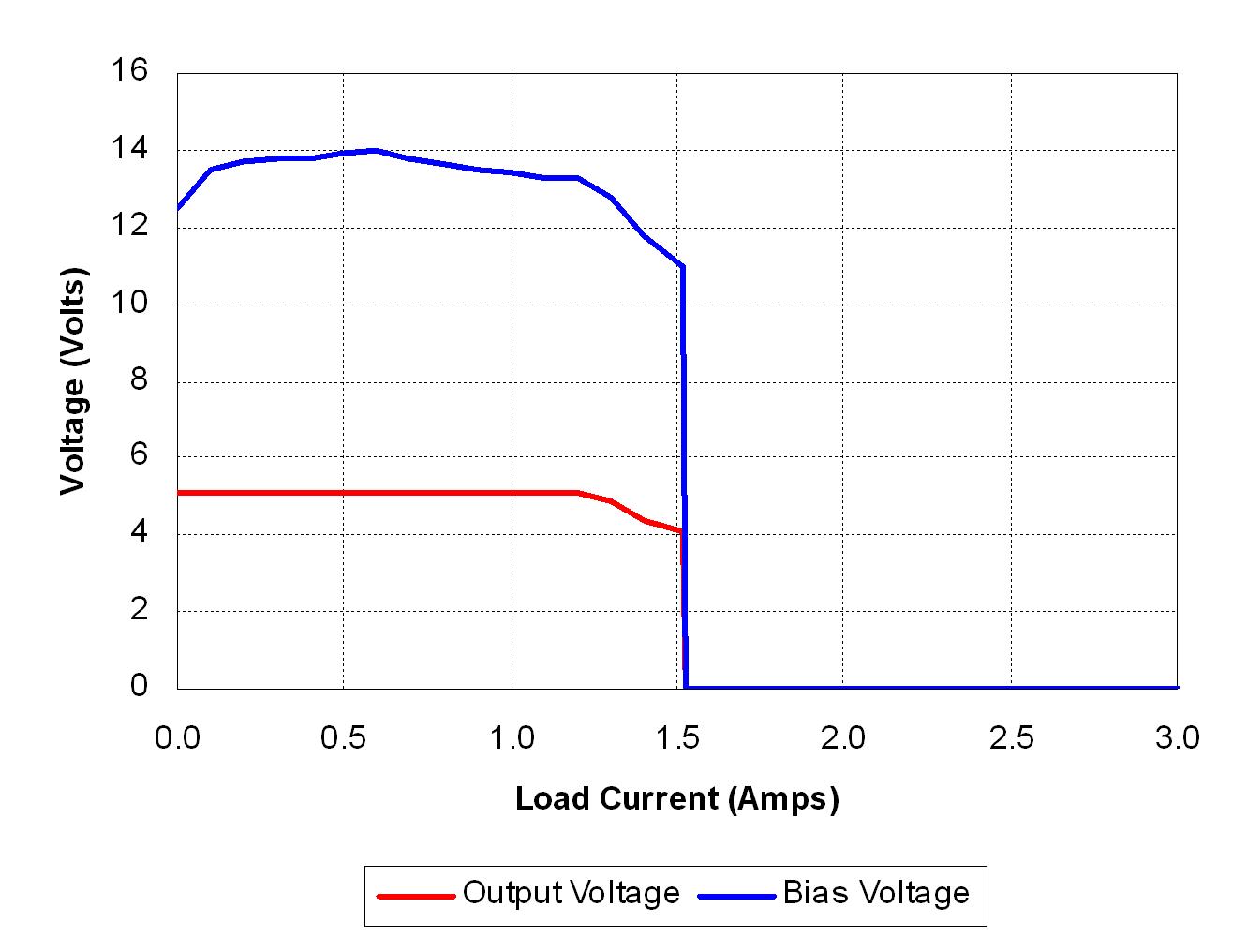 圖3顯示了輸出和偏置電壓與圖2所示電路負(fù)載電流的對(duì)比情況。輸出V-I特性非常接近于圖1所示理想情況。負(fù)載電流達(dá)到約1.3A時(shí)開(kāi)始功率限制。隨著負(fù)載增加,輸出電壓開(kāi)始下降。由于偏置電壓是輸出電壓的反映,因此它也開(kāi)始下降。偏置電壓降至9V關(guān)閉水平以下時(shí),PWM控制器關(guān)閉。