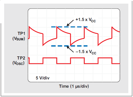 著名的三反相門振蕩器由 U1a、U2a 和 U2b 組成,選擇它是因為它在供電波動方面較為穩定。通過一個 100-pF 陶瓷電容器(COSC)和兩個 10-kΩ 電阻器(ROSC1 和 ROSC2),它的正常頻率被設定為 330kHz。在 3.0-V 到 3.6-V 電源電壓波動范圍內,振蕩器擁有接近 50% 的占空比,以及低于 ±1.5% 的最大頻率波動。圖 2 顯示了 ROSC1 和 ROSC2 (TP1) 相加點和振蕩器輸出 (TP2) 處的波形。所有電壓均為參考電路基準電壓測得。[page]