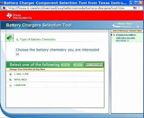 電池充電器工具使得設(shè)計人員選擇正確的充電器的過程更輕松。圖 3 是 TI 網(wǎng)站上提供的一種工具的示例。