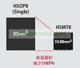 根據不同用途,提供3種小型封裝。HSMT8比HSOP8的安裝面積減少了65%,為節省空間做出巨大貢獻。而且,產品陣容中還包括DC/DC電源電路中的高邊(High Side)用MOSFET與低邊(Low Side)用MOSFET復合化的新封裝HSOP8(Dual)。不僅安裝面積減小,而且還可有助于減少安裝次數。