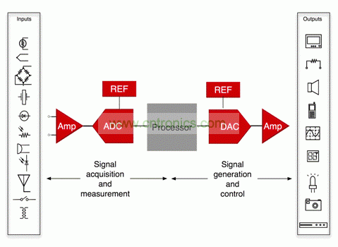圖 1 所示結構圖可代表信號處理的所有系統。如果它是一個測量或者數據采集系統,則信號鏈開始于傳感器,經過信號調節電路,進入一個 ADCr,然后結束于處理器。如果它是一個控制系統、一個音頻處理系統亦或是一個軟件定義無線電設備則可能存在一些必須變回到模擬信號的處理器輸出;這種情況顯示在結構圖的右手側二分之一處。