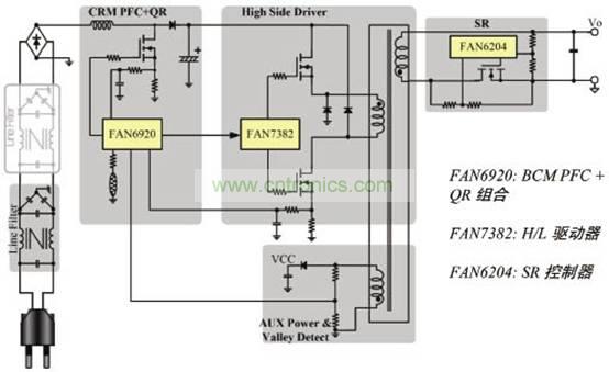 雙管反激解決方案分為三個部分,分別是FAN6920: BCM PFC + QR 組合;FAN7382: H/L 驅動器;FAN6204: SR控制器,如圖1所示。