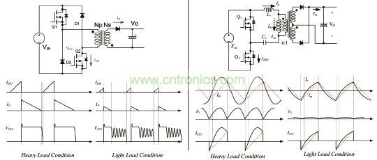 雙管QR反激與LLC諧振轉換器如圖4所示,左邊為雙管QR反激,右邊為LLC諧振轉換器等特點。