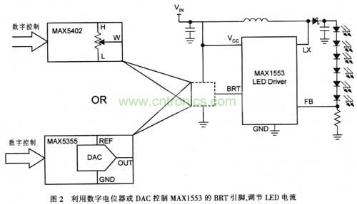 但在當(dāng)前的許多應(yīng)用中,DAC與數(shù)字電位器之間選擇的界限比較模糊,圖2中的DAC和數(shù)字電位器都可用于控制MAXl553 LED驅(qū)動器。MAXll53亮度(BRT)輸入的直流電壓和檢流電阻決定了LED的電流。