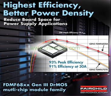 當能效標準逐漸成為電子產品新的緊箍咒,各大電源半導體廠商不得不面對電源管理技術的全新挑戰。飛兆半導體 FDMF68xx Gen III DrMOS多芯片模塊(MCM)系列經設計能夠降低輸出感量和減少輸出電容器數目,與普通分立器件解決方案相比,該系列能夠節省多達50%的線路板空間,并提高效率,以期滿足新能源標準要求。使用飛兆半導體的高性能PowerTrench® MOSFET技術,FDMF68xx系列能夠顯著減少開關振鈴(switch ringing),省去大多數降壓轉換器應用中使用的緩沖器電路。FDMF68xx系列配合針對刀片式服務器、高性能筆記本電腦、游戲主機和負載點(point-of-load)模塊的新能源標準和系統規范,正在推動業界對更高效率、更大電流、更高開關頻率以及更大功率密度的需求。