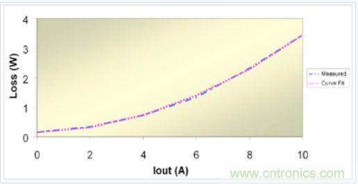 實際損耗與三項式之間的相關性非常好。圖 2 對同步降壓穩壓器的測量數據與曲線擬合數據進行了對比。我們知道,在基于求解三個聯立方程組的曲線上將存在三個重合點。對于曲線的剩余部分,兩個曲線之間的差異小于2%。由于工作模式(如連續或非連續)不同、脈沖跳頻或變頻運行等原因,其他類型的電源可能很難以如此匹配。這種方法并非絕對可靠,但是有助于電源設計人員理解實際電路損耗情況。