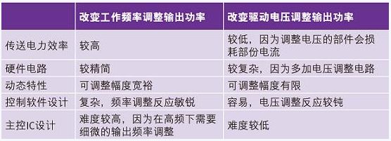 在諧振系統(tǒng)中調(diào)整功率的方式另外還有改變線圈上的電感值或電容值的方法,但在實(shí)際量產(chǎn)上并不容易完成所以不被采用。在圖(五)是無線充電聯(lián)盟規(guī)格書中所提的兩種控制發(fā)射線圈輸出功率的方法,第一種是變頻調(diào)整式,另一種則是變壓調(diào)整式。