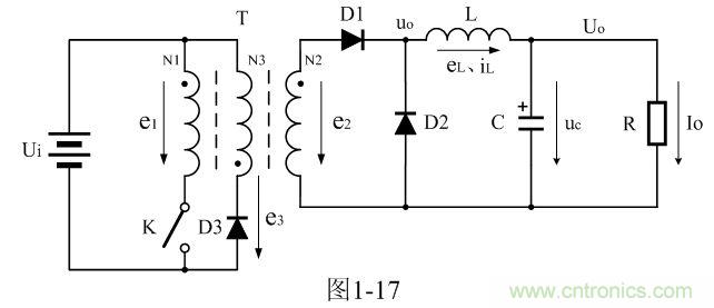 圖1-17是正激式變壓器開關電源的簡單工作原理圖,圖中,Ui是開關電源的輸入電壓,T是開關變壓器,N1、N2、N3分別為開關變壓器的3個線圈繞組,e1、e2、e3分別為3個線圈繞組產(chǎn)生的感應電動勢,K是控制開關,D1是整流二極管,D2是續(xù)流二極管,D3是削反峰整流二極管,L是儲能濾波電感,C是儲能濾波電容,R是負載電阻;uo為整流輸出電壓,或濾波輸入電壓、eL為儲能濾波電感產(chǎn)生的感應電動勢、iL為流過儲能濾波電感L的電流、Uo為濾波輸出電壓、Io為流過負載的電流。