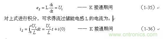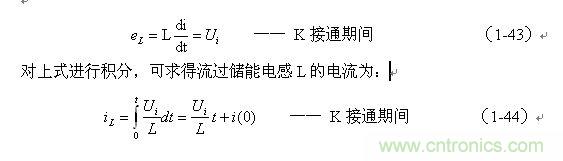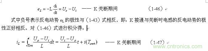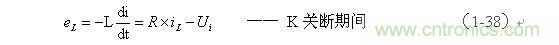 式中的負號表示反電動勢eL的極性與(1-35)式中的符號相反,即: K關斷期間電感L產生電動勢的方向與K接通期間電感L產生電動勢的方向正好相反。