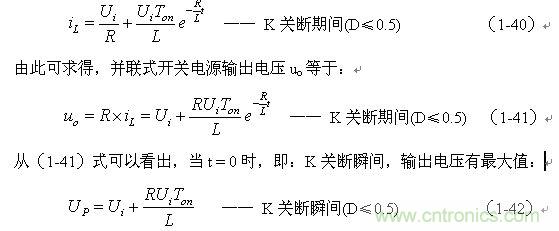 式中C為待定常數,把初始條件(令t = 0)代入上式,很容易就可求出C。由于控制開關K由接通狀態突然轉為關斷時,流過儲能電感L中的電流iL不能突變,即i(Ton+) = i(Toff—),并且正好等于流過儲能電感L的最大電流ILm ,因此(1-39)式可以寫為: