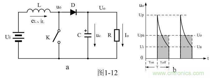 在圖1-12-a中,當控制開關K接通時,輸入電源Ui開始對儲能電感L加電,流過儲能電感L的電流iL開始增加,同時電流在儲能電感L中也要產生反電動勢eL;當控制開關K由接通轉為關斷的時候,在儲能電感L兩端就會產生反電動勢eL。eL反電動勢的方向與開關K關斷前的方向相反,但與電流的方向相同,因此,在控制開關K兩端的輸出電壓uo等于輸入電壓Ui與反電動勢eL之和。