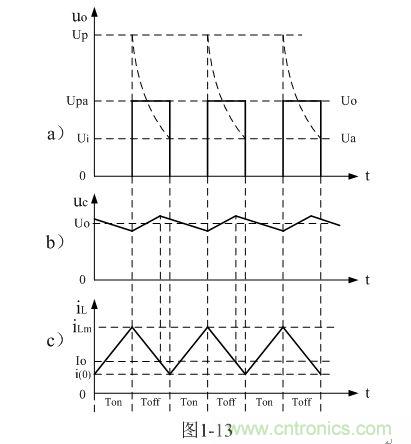 圖1-12-b表示并聯式開關電源輸出電壓中各種成份之間的關系。其中,Ui為輸入電壓、 uo為并聯開關K兩端的輸出電壓、Up為輸出電壓uo的峰值,Upa是輸出電壓uo的半波平均值,Ua是輸出電壓uo的平均值,Uo為直流輸出電壓。