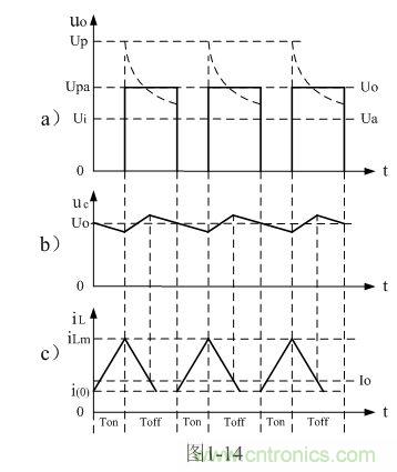圖2-13-a、圖2-14-a、圖2-15-a分別為開關電源工作于臨界電流連續、電流不連續、電流連續狀態時,圖2-12-a電路中各點的電壓、電流波形。圖2-13-b、圖2-14-b、圖2-15-b分別為3種狀態之下,濾波電容兩端的紋波電壓波形。圖2-13-c、圖2-14-c、圖2-15-c分別為3種狀態之下,流過儲能電感的電流波形。不過,圖中這些波形相對來說還是比較粗略和簡單的,如需要對它們更嚴密的表達和分析,請參考后面圖1-24和圖1-25相關的內容。