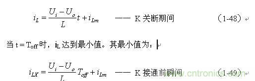 式中i(Ton+) 為控制開關K從Ton轉換到Toff的瞬間之前流過電感的電流,i(Ton+)也可以寫為i(Toff-),即:控制開關K關斷或接通瞬間,之前和之后流過電感L的電流相等。實際上(1-47)式中的i(Ton+) 就是(1-45)式中的iLm,因此,(1-47)式可以改寫為: