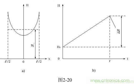 圖2-20-a和圖2-20-b分別是由(2-56)式給出的,鐵芯片中磁場強度按水平方向分布的函數H(x)和按時間分布的函數H(t)曲線圖。