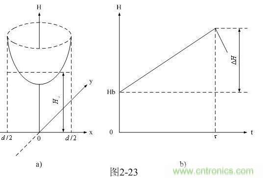圖2-23-a和圖2-23-b是圓柱形變壓器鐵芯中磁場強度按水平方向分布的函數H(x,y)曲面圖和按時間分布的函數H(t)曲線圖。