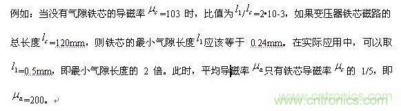 最大值的條件;當然是氣隙長度越小,平均導磁率 就越大。但在實際工作中, 的值要小于此值,因為,對氣隙長度要預留一定的余量,變壓器鐵芯的工作點不可能讓永遠工作在最佳值的邊沿;因此,實際工作中的變壓器鐵芯,其最大磁感應強度增量和最大磁場強度增量都會超出(2-68)式給出條件的范圍;所以,由(2-68)式求出的氣隙長度 也是最低極限值。