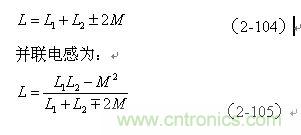 【說明】互感M有正負,圖2-41-a和圖2-41-c的接法互感M為正,圖2-41-b和圖2-41-d的接法互感M為負。兩個線圈之間的互感M為: