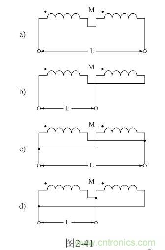 兩線圈的連接方法如圖2-41所示。其中圖2-41-a和圖2-41-b分別為正、反向串聯;圖2-41-c和圖2-41-d分別為正、反向并聯。