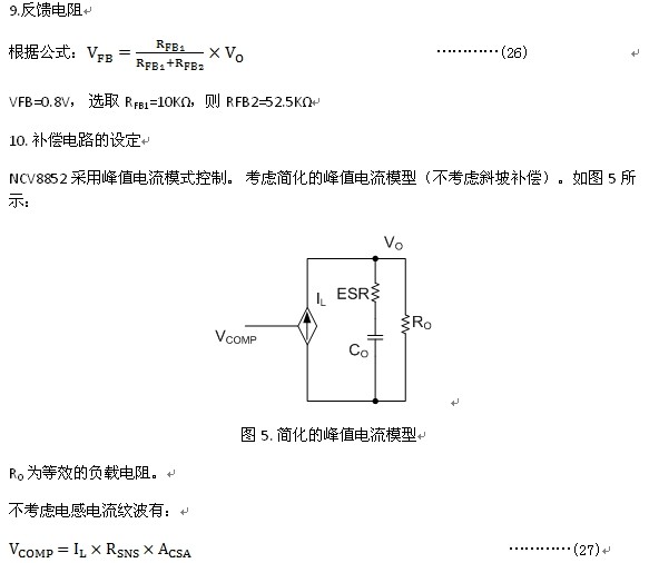 NCV8852是一款外接P溝道MOSFET的非同步BUCK 控制器。輸入電壓可高達44V,適用于12V蓄電池系統。 采用峰值電流控制,系統易于穩定,響應快。可通過在ROSC管腳外接電阻將工作頻率設定在100kHz 到500kHz。圖4為NCV8852的典型應用電路。ISNS管腳檢測上管電流,用于峰值電流控制以及過流保護。COMP管腳為誤差放大器的輸出,外接RC電路以補償環路。