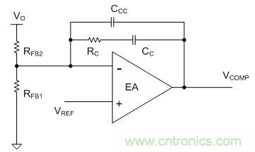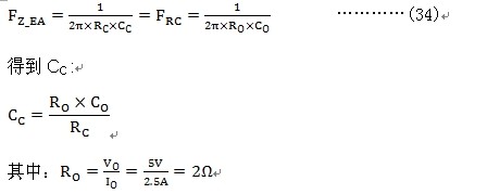 因為電路采取用瓷片電容,所以不用去消除由ESR造成的零點。CCC 不接。 如果采用的是電解電容則需要把反饋電路的極點放到主電路ESR零點附近。可根據下式計算CCC