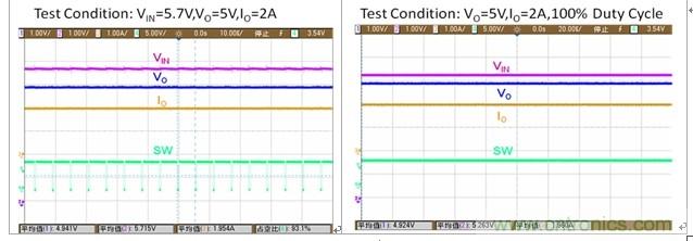 取VIN=5.7V,VO=5V,IO=2A,VD=0.3V, Rdson=50m?, DCR=70m?, 可以計算所需要的占空比為: