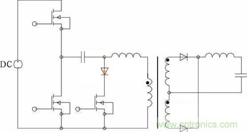對稱式PWM 控制ZVS半橋變換器(見圖1),其與傳統半橋電路相比,對稱PWM 控制的ZVS直流變換器增加了一個由輔助開關管和一個二極管組成的支路。其主開關管不僅工作在對稱狀態,而且下管和輔助開關管可在全負載范圍內實現 ZVS,上管也能在寬負載范圍內實現ZVS,引起的附加損耗很小。該變換器器件所受應力小,可靠性高,其更適合采用MOSFET做開關管,較少應用于高電壓、大功率場合。該變換器需要利用諧振電感的儲能來實現開關管的ZVS,增大諧振電感能擴大上管ZVS范圍,但會使占空比丟失嚴重,設計諧振電感時須權衡考慮實現上管ZVS和減小占空比丟失。