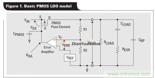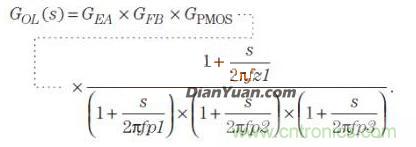 線性電源的等效模型模型如圖1所示, 穩定直接如圖可知,電路的三個極點和一個零點,即得到開環傳遞函數Gop,GEA是誤差放大器的增益,GFB是反饋環路的增益,GPMOG是PMOS的增益。