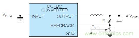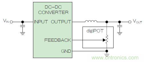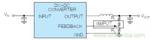 圖2. 使用數字電位計調整DC-DC轉換器輸出電壓,組成可變反饋電阻