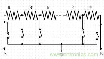 圖3:顯示電子開關的64位數字電位計。同一時間只能閉合一個電子開關,該開關決定電阻比。