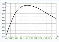圖5中,橫坐標(biāo)表示變壓器副邊繞組匝數(shù)N2,縱坐標(biāo)表示輸出電壓U0,在L=100μH,Ui=520V,f=20kHz,N2=60時(shí),輸出電壓U0為峰值。
