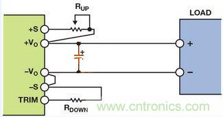 輸出電壓可通過(guò)改變連接電源模塊正輸出端或接地端的電阻來(lái)進(jìn)行調(diào)節(jié)通過(guò)連接外部電阻RUP并使RDOWN浮空,可以向上調(diào)整輸出電壓(高于標(biāo)稱(chēng)輸出電壓),或者通過(guò)連接外部電阻RDOWN并使RUP短路(電阻值為零)向下調(diào)整(低于標(biāo)稱(chēng)輸出電壓)。