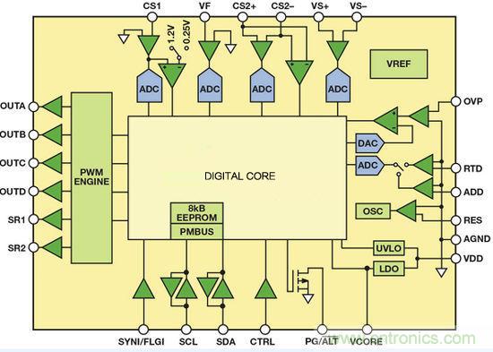 該器件非常適合高密度DC-DC電源轉(zhuǎn)換,具有6個(gè)可編程脈沖寬度調(diào)制(PWM)輸出,可控制大部分高效電源拓?fù)洹A硗猓撈骷€能控制同步整流(SR),并集成6個(gè)模數(shù)轉(zhuǎn)換器(ADC),能夠采樣模擬輸入電壓、輸入電流、輸出電壓、輸出電流、溫度以及其它參數(shù)。轉(zhuǎn)換為數(shù)據(jù)后,將這些信號(hào)發(fā)送至數(shù)字內(nèi)核模塊進(jìn)行處理。該器件采用靈活的狀態(tài)機(jī)架構(gòu),以硬件實(shí)現(xiàn)全部功能,提供穩(wěn)定可靠的解決方案,但無(wú)法通過(guò)編程實(shí)現(xiàn)設(shè)計(jì)以外的功能。器件的全部功能--包括輸出電壓調(diào)整--均以數(shù)字方式處理。為了調(diào)整輸出電壓,應(yīng)通過(guò)PMBus接口發(fā)送一條命令,改變數(shù)字基準(zhǔn)電壓值。