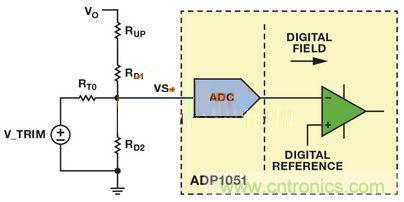 考慮整個(gè)控制環(huán)路,輸出電壓通過(guò)電壓分壓器或者運(yùn)算放大器縮放到合適的值,然后輸入給VS+引腳。ADC對(duì)該電壓進(jìn)行采樣。數(shù)字內(nèi)核知道數(shù)字化的輸出電壓值只采用邏輯電平信號(hào)工作,因此無(wú)法使用外部基準(zhǔn)電壓并旁路內(nèi)部比較器和濾波器。受限于這種固定的硬件配置,向后兼容現(xiàn)有模擬調(diào)整功能的唯一途徑是調(diào)節(jié)VS+引腳上的ADC檢測(cè)電壓。一種方法是重新配置反饋網(wǎng)絡(luò)。