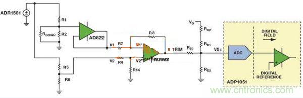 圖5中的電路具有兼容模擬向上或者向下調(diào)壓的功能兩個(gè)電阻分壓器產(chǎn)生兩個(gè)基準(zhǔn)電壓,其中一個(gè)基準(zhǔn)電壓表示模擬控制器所需的輸出基準(zhǔn)電壓,另一個(gè)表示內(nèi)部基準(zhǔn)電壓。利用一個(gè)電壓跟隨器來(lái)避免所需的輸出基準(zhǔn)電壓與后續(xù)電路相互影響。利用AD822 FET輸入運(yùn)算放大器,將所需的輸出基準(zhǔn)電壓(V1)從模擬控制器的內(nèi)部基準(zhǔn)電壓(V2)中去除,得到所需的電壓差。此電路的線(xiàn)性放大增益確保了VTRIM足夠大,從而能對(duì)VVS+產(chǎn)生影響。