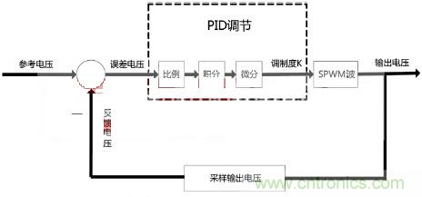 由于輸入電壓隨著負載變大會有降低,切系統濾波電感具有電阻成分,這些因素導致在系統開環下負載調整率較大,因此本系統采用閉環反饋調整輸出電壓穩定在10V。我們選用經典PID反饋調整,對輸出電壓進行采樣,與參考電壓比較得到誤差電壓后進行位移式PID調節,PID運算輸出作為SPWM的調制度K,與正弦波表相乘后形成新的波表進行生成SPWM波運算。用此方法后負載調整率降到了1%以下,圖5是反饋過程框圖。