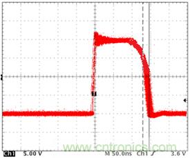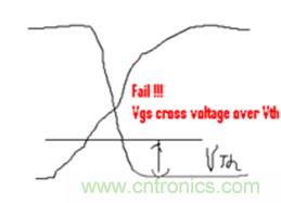 下面這種情況有非常多的人會忽視,甚至是一些比較有經(jīng)驗的電源測試工程師。下面組圖四是下管打開,上管關(guān)閉時候的波形(圖4-1是示意圖,圖4-2示實際測試圖)。雖然沒有被同時帶起的情況,但是請注意上下管有交叉的現(xiàn)象,而且交叉點的電平遠高于MOS管規(guī)定的Vth值,這是個嚴重的shoot through現(xiàn)象。最直接的后果就是MOS管燒毀!