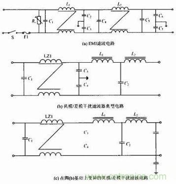 開關電源對內、外的干擾及抗干擾中,共模信號與開關器件的工作方式、散熱器的安裝及整機PCB板與機殼的連接有相當復雜的關系,共模信號在一定的條件下又可轉變成差模信號。其中解決共模干擾除了上述一般的EMI濾波電路,還可按如下電路圖的思想在電路上改進,使開關電源能夠在電路上改進從而提高性能。圖1(b)為共模/差模干擾濾波器典型電路,圖1(c)為在圖1(b)基礎上變異的共模/差模干擾濾波電路。