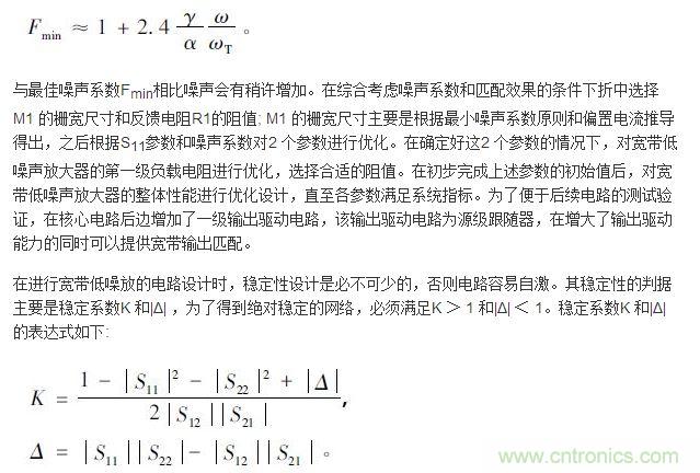【導讀】本文給出了一種1 ~ 3 GHz 頻段的寬帶低噪聲放大器的設計,電路采用電阻負反饋結構,采用SMIC 0.18 μm RF CMOS 工藝對寬帶低噪聲放大器進行了優化分析和仿真,結果表明在寬帶匹配、通道增益及噪聲系數方面都取得了較好的性能,對于寬帶低噪聲放大器的設計具有一定的參考價值。