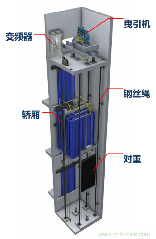 傳統(tǒng)電梯的動(dòng)力部分主要由曳引機(jī)(卷揚(yáng)機(jī))、變頻器、轎廂、鋼絲繩、對重組成。曳引機(jī)通過卷動(dòng)鋼絲繩,調(diào)節(jié)轎廂和對重的平衡,實(shí)現(xiàn)對轎廂高度的控制,即電梯的上下。其中曳引機(jī)本質(zhì)就是一臺由變頻器驅(qū)動(dòng)與控制的大功率電機(jī),需要安置在大樓頂層——這就造成了電梯無法上頂層的問題了,因?yàn)轫攲拥碾娞菸恢帽灰芬龣C(jī)和變頻器占據(jù)了。這問題一直存在了很久的時(shí)間,因?yàn)檫^去曳引機(jī)基本都用交流異步電機(jī),且功率輕松上幾十KW,體積非常大,且不能露天放置,只能一直占著頂樓的房間。