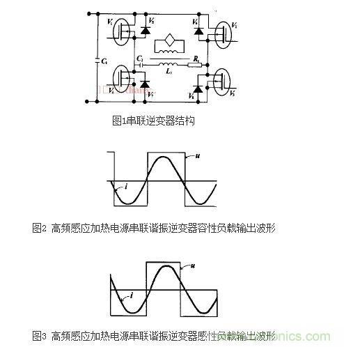 作為高頻感應加熱電源設備的重要組成部分,串聯諧振逆變器在工作中具有損耗低、工作適應性良好等優勢。這種逆變器在實際應用中也被稱為電壓型逆變器,其基礎結構的原理圖如圖1所示。在實際工作的過程中,串聯諧振型逆變器的輸出電壓為近似方波。由于電路工作在諧振頻率附近,使振蕩電路對于基波具有最小阻抗,所以負載電流ia近似正弦波。同時,為避免逆變器上、下橋臂間的直通,換流必須遵循先關斷后導通的原則,在關斷與導通間必須留有足夠的死區時間。下圖中的圖2和圖3分別示出容性負載和感性負載的輸出波形。