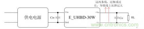 根據(jù)數(shù)據(jù)手冊要求連接E2405UHBD-30W電源模塊外圍電路,負載使用電子負載儀加滿載,供電電源使用可編程直流電源。模塊上電,電子負載儀上顯示的電壓值不是5.0V,而是4.7V,然而在測量電源模塊輸出引腳兩端的電壓值是5.0V。什么原因呢?E2405UHBD-30W模塊滿載時,輸出電流有6A,而模塊引腳到負載儀端口之間的連接線太長了,使得連接線的阻抗值大。如果阻抗為0.05歐姆,那么連接線上的電壓差為0.05Ω*6A=0.3V,這個就是模塊輸出引腳到負載儀端口的壓差。