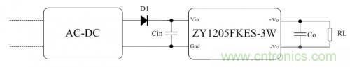 AC-DC電源模塊輸出電壓為12V,最大輸出電壓精度為±3%,那么輸出電壓范圍是11.64V~12.36V。而二極管D1使用1N4148,正向?qū)▔航禐?.7V,那么ZY1205FKES-3W模塊實際輸入電壓的范圍只有為10.94V~11.66V,這個電壓范圍還是在ZY1205FKES-3W模塊的輸入電壓范圍內(nèi),模塊可以正常工作,只是輸出電壓會較低。